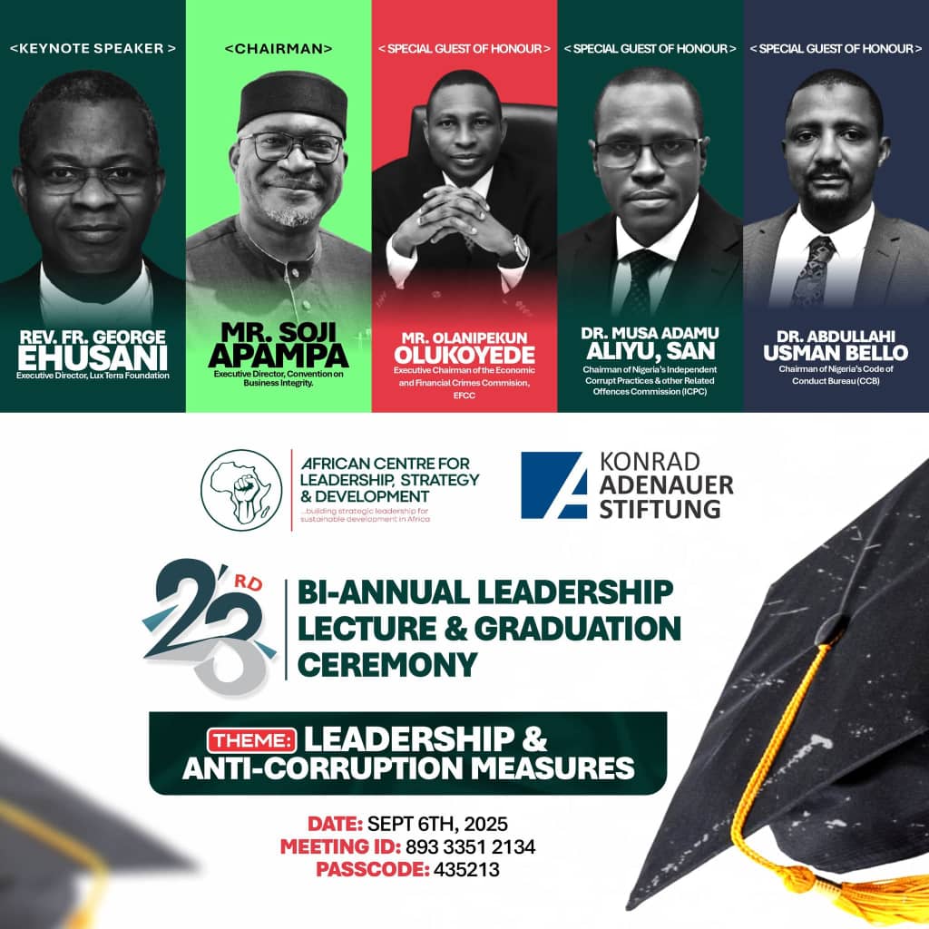 The African Centre for Leadership, Strategy and Development (Centre LSD), will hold graduation ceremony and annual lecture for Set 23, of its Leadership School on Sept.6.