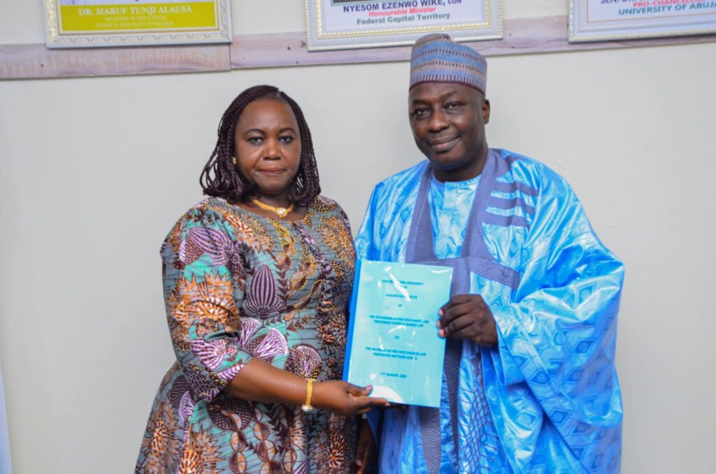 Outgoing Acting Vice-Chancellor, Prof. Patricia Lar, and incoming Acting Vice-Chancellor, Prof. Matthew Adamu, during the handover ceremony on Monday in Abuja.