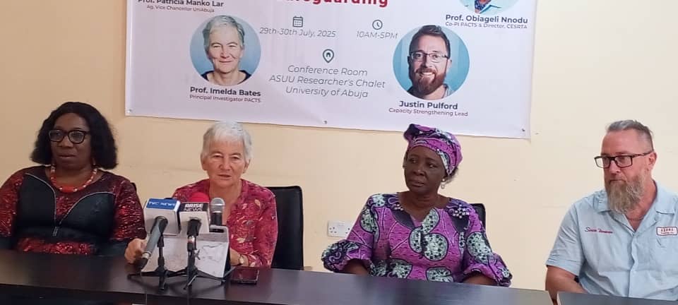 From Left, Prof. Obiageli Nnodu Co-Principal Investigator PACTS and Director CESRTA, Prof. Imelda Bates, Principal Investigator PACTS, Prof. Rhoda Mundi Senior Special Assistant to the Vice-Chancellor University of Abuja and Justin Pulford, Capacity Strengthening Lead at a workshop in University of Abuja.